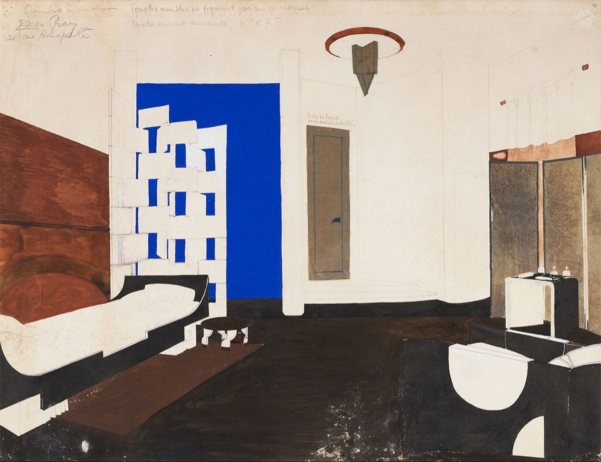 Spending a few minutes with Gray’s boudoir. The bold blue! I wonder if that suggests a plane or a wall, probably a plane. The bed is architectural, anchored in space. Both bed and daybed, its symmetry sleigh-like, its horizontal orientation doesn’t read as head-here-feet-there. The floor is mostly unobstructed. The stars for me are her famed screens. We don’t really use screens this way now, but here it’s interesting to consider within historical context of the boudoir. Coming from the French verb bouder, to sulk, these rooms were an expression of femininity (dressing, getting ready) and a retreat from social life (taking private meetings, writing letters).